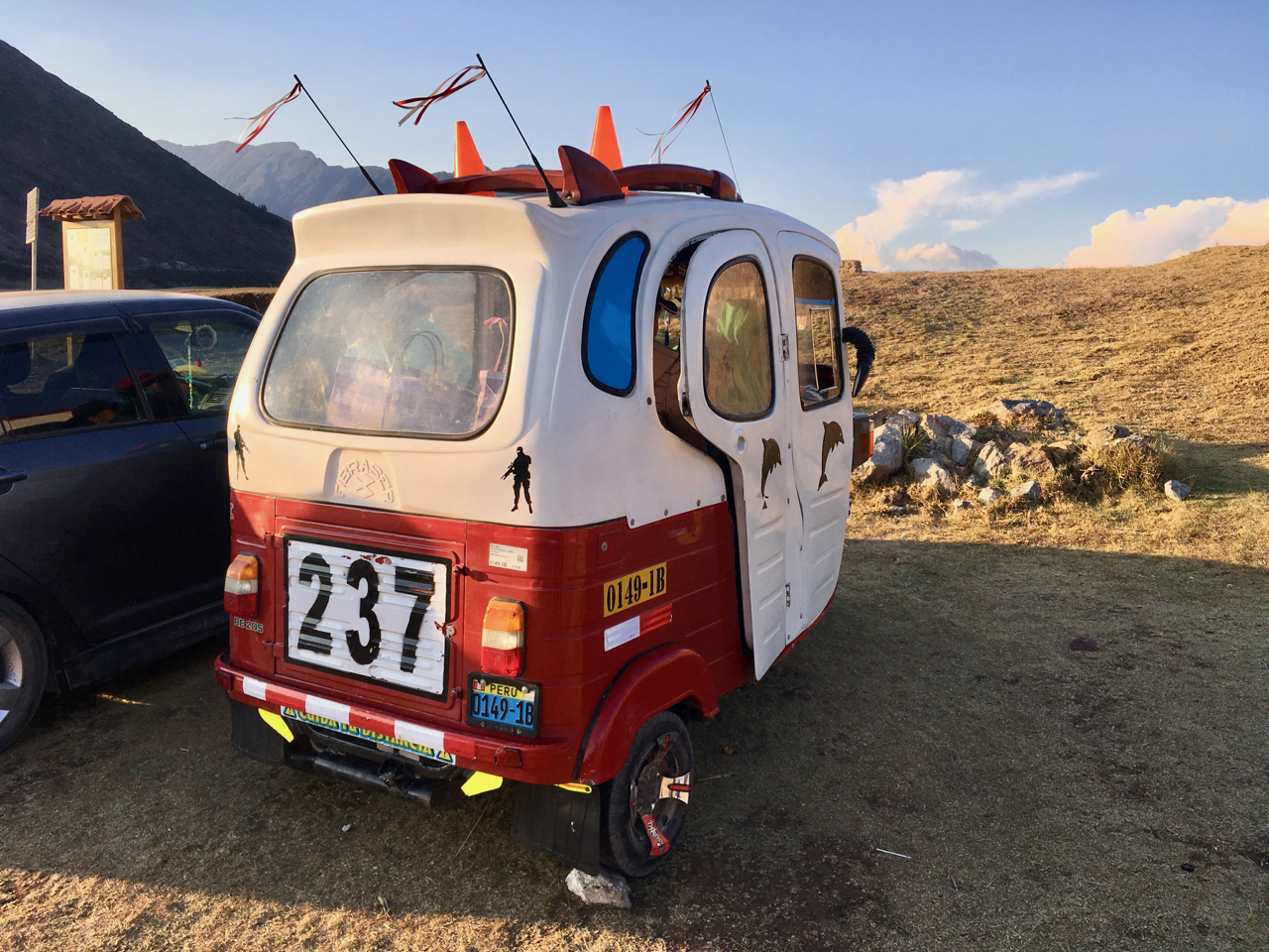 Somewhat low on water, the last locals to leave were kind enough to ply us with beer, Coca-Cola and Inka cola! I was particularly fond of their mototaxi, decorated with masked gunmen and dolphins!