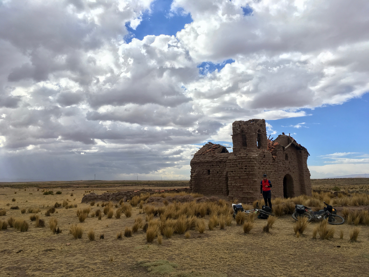 As we neared the clouds, the winds picked up and we decided to find some shelter to at least wait it out or possibly camp. Not far from the road was a small abandoned church that was just the ticket…