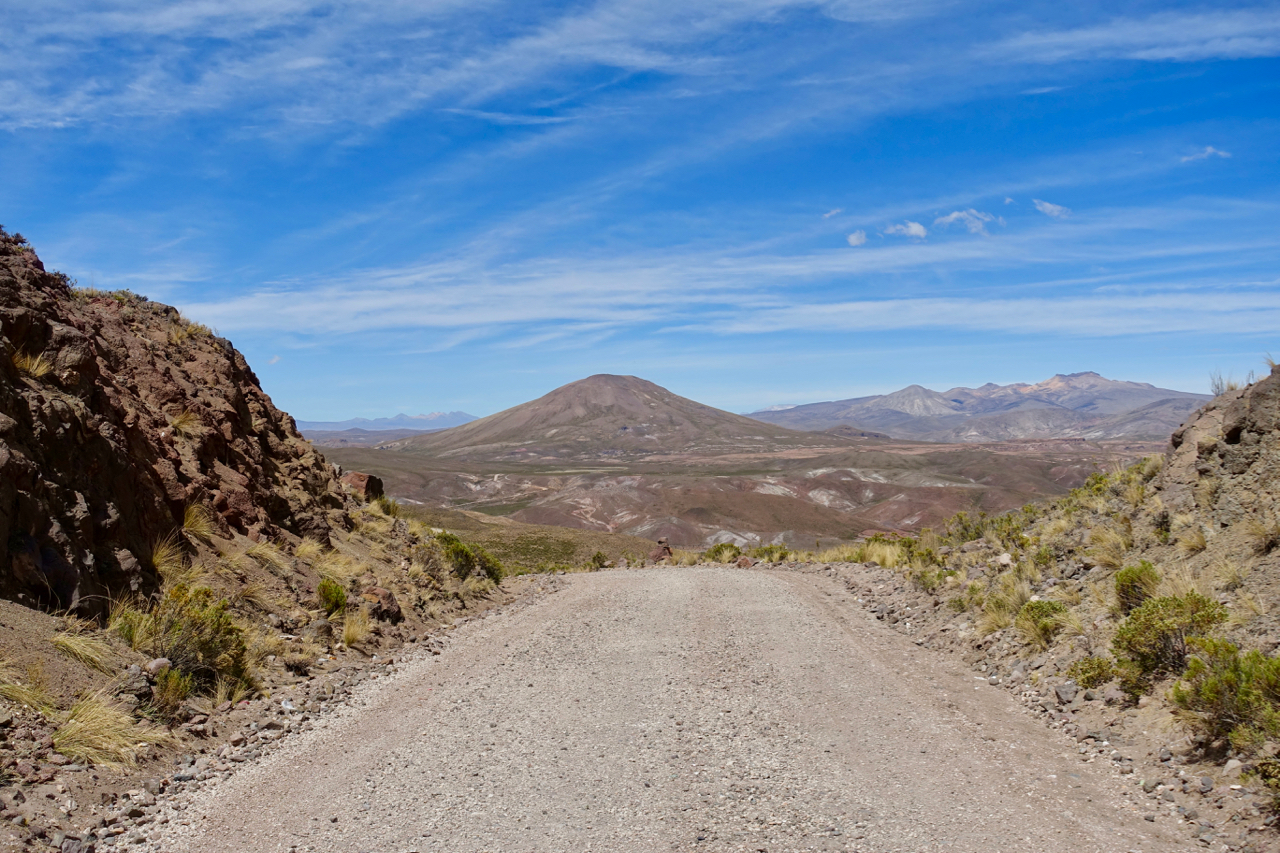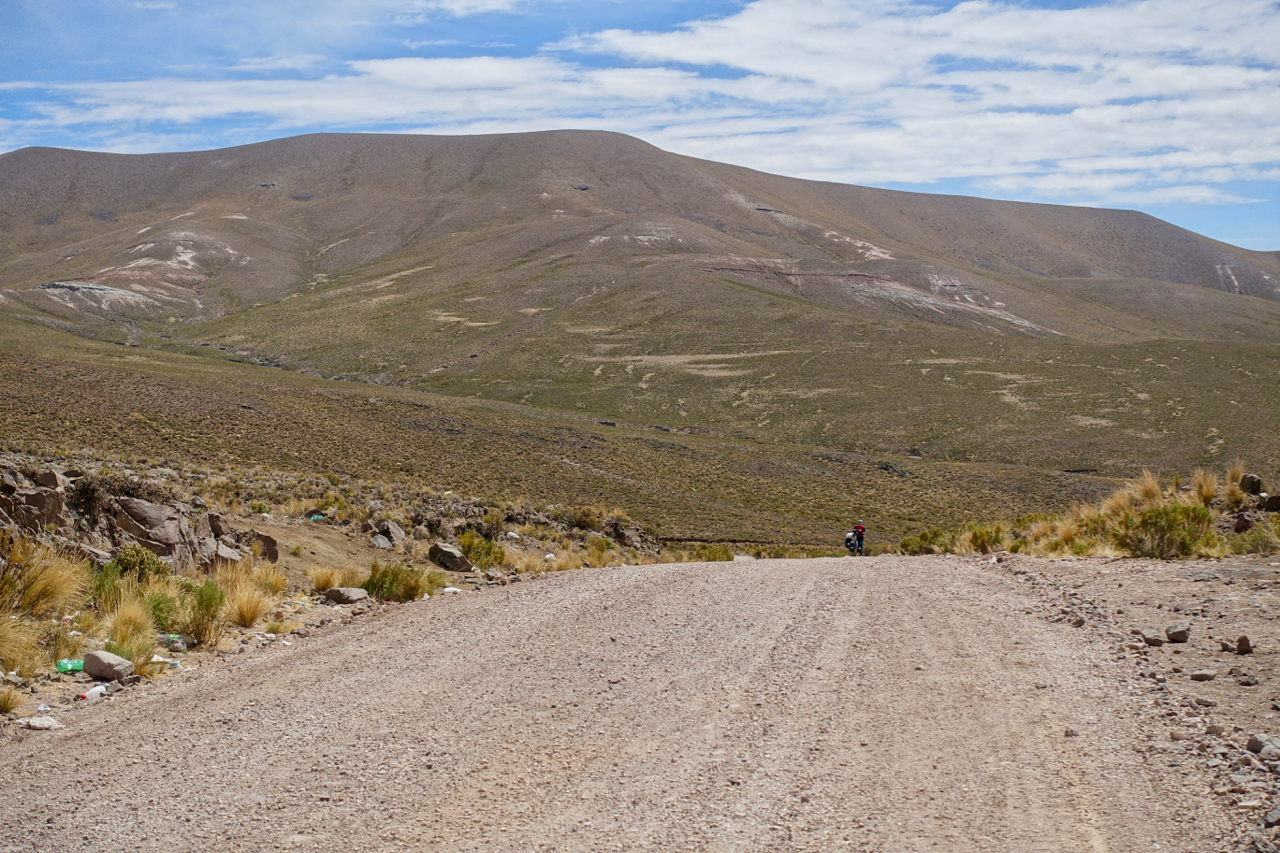 So, I headed off through increasingly impressive terrain towards the Chilean border. What promised to be a nice, gentle ride soon deteriorated, however, as a fierce headwind sprung up. Most vehicles that went past didn’t slow down at all, covering me with dust and prompting me to have to hold my breath, not an easy proposition when you’re doing full-on exercise at 4000m!