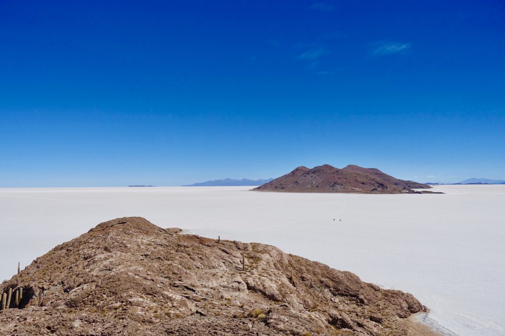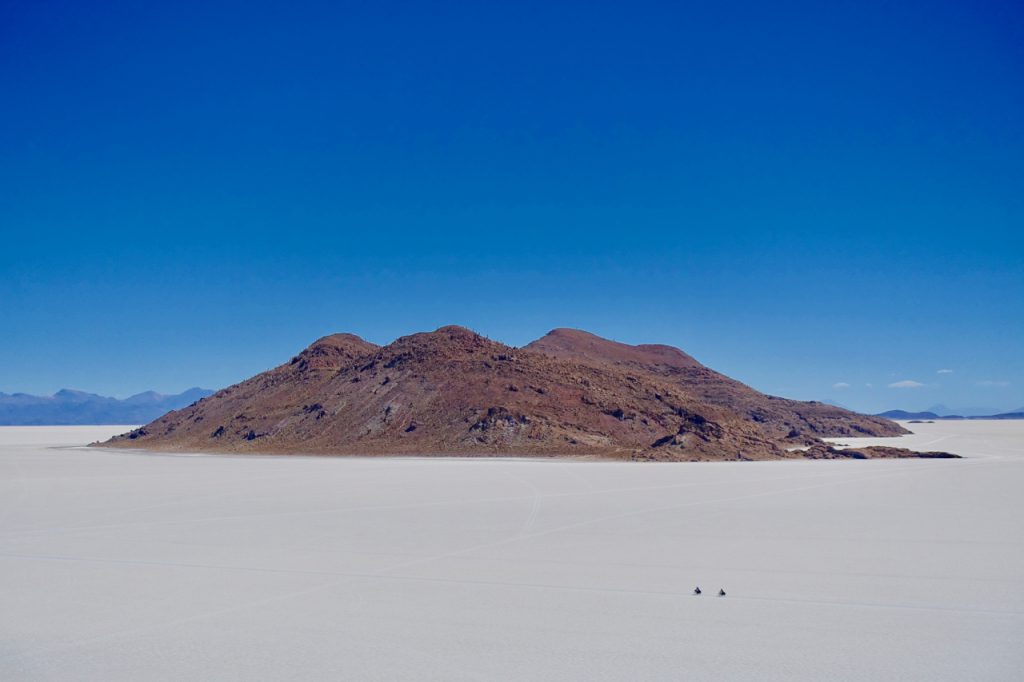 The next morning we set off to cross the Salar de Uyuni. It’s fair to say that many South American cycle tourists rate this as one of the highlights of their trips so expectations were pretty high. It didn’t disappoint. Cycling along a straight path towards an island that is below the horizon on such a wide, open expanse is pretty incredible. The cycling is not the most stimulating – you get stiff and sore quite quickly because you are in exactly the same position non-stop – but there are few places in the world that can compare to it. Some people prefer Coipasa as there are fewer tourist jeeps etc but, for me, the scale of Uyuni was unbeatable. To give you an idea, it’s about 140km to cycle across (the normal route). I cycled on ahead and climbed up one of the islands at one point to make sense of the scale of the place…