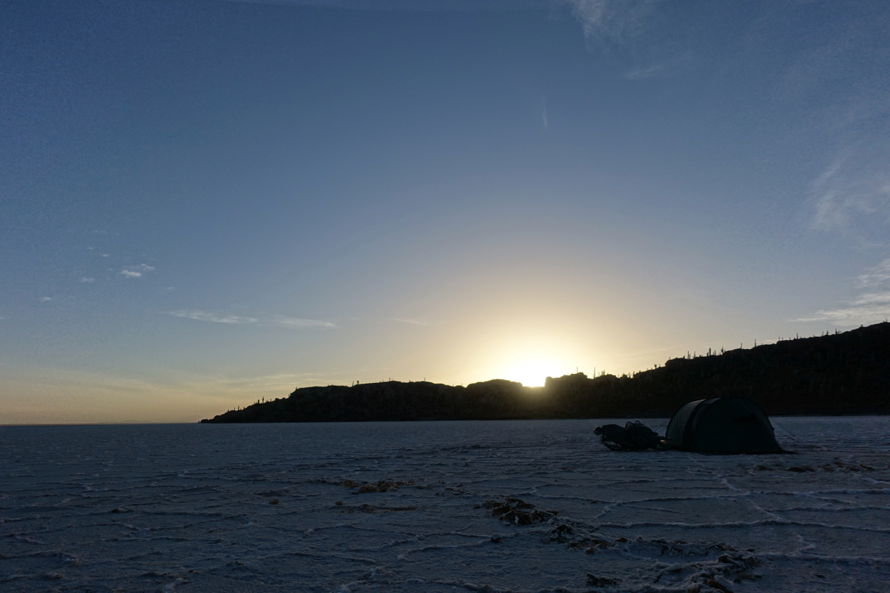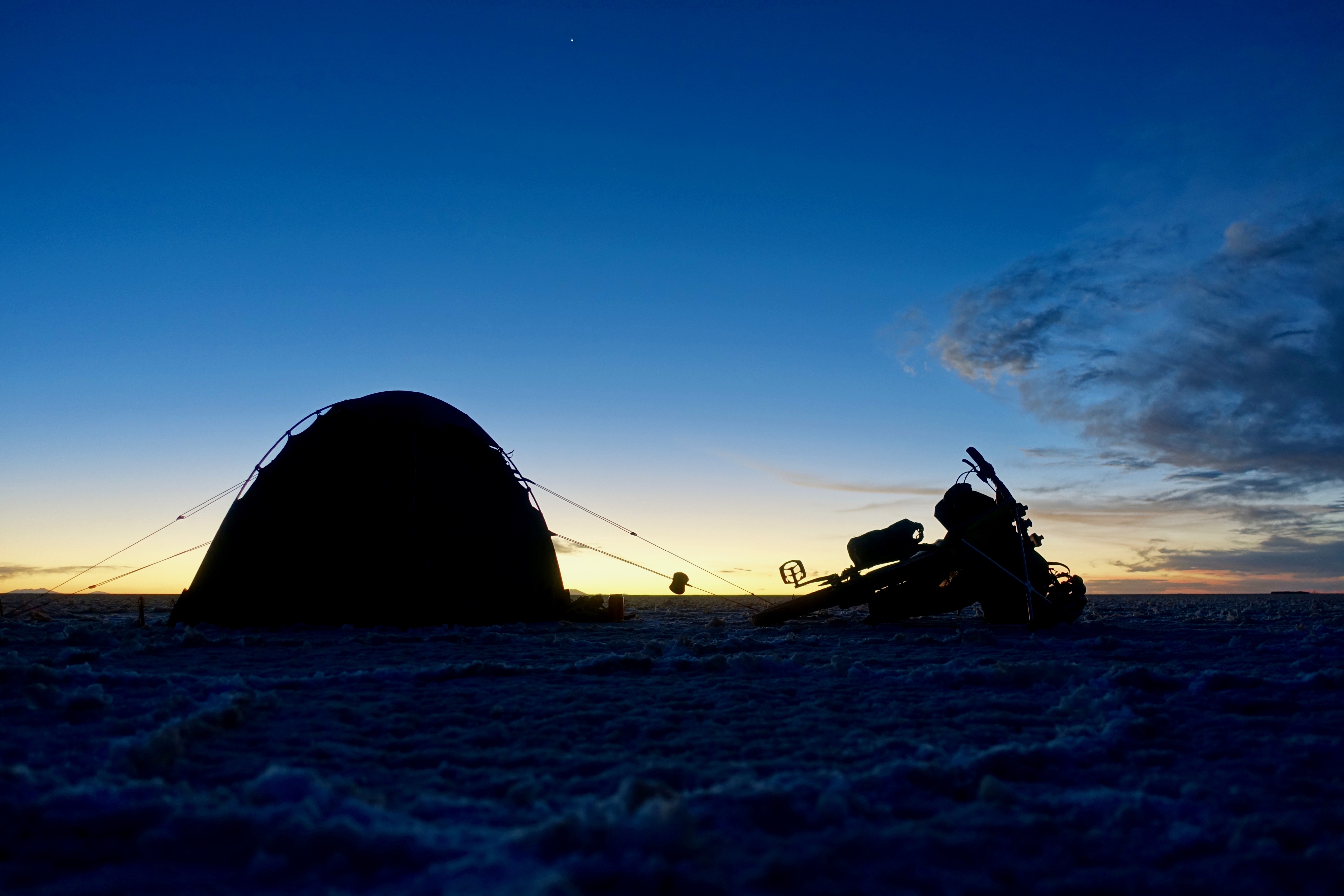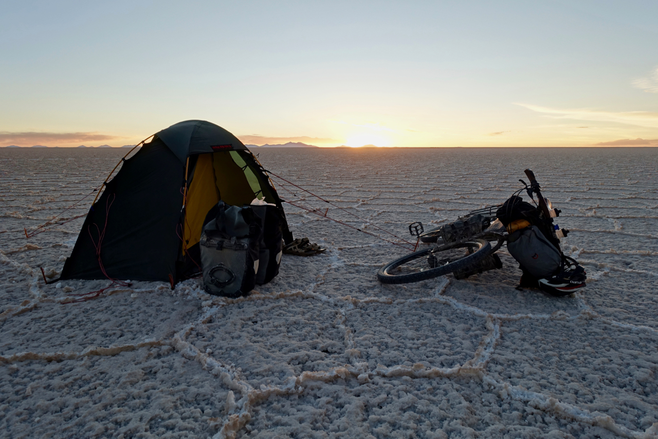 With the headwind, we decided to take it fairly easy and camp out on the Salar that night. After a quick visit to the Salt Hotel (you can no longer stay there), we set up camp out on the open salt. Sunset was absolutely magical…