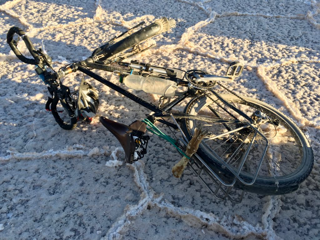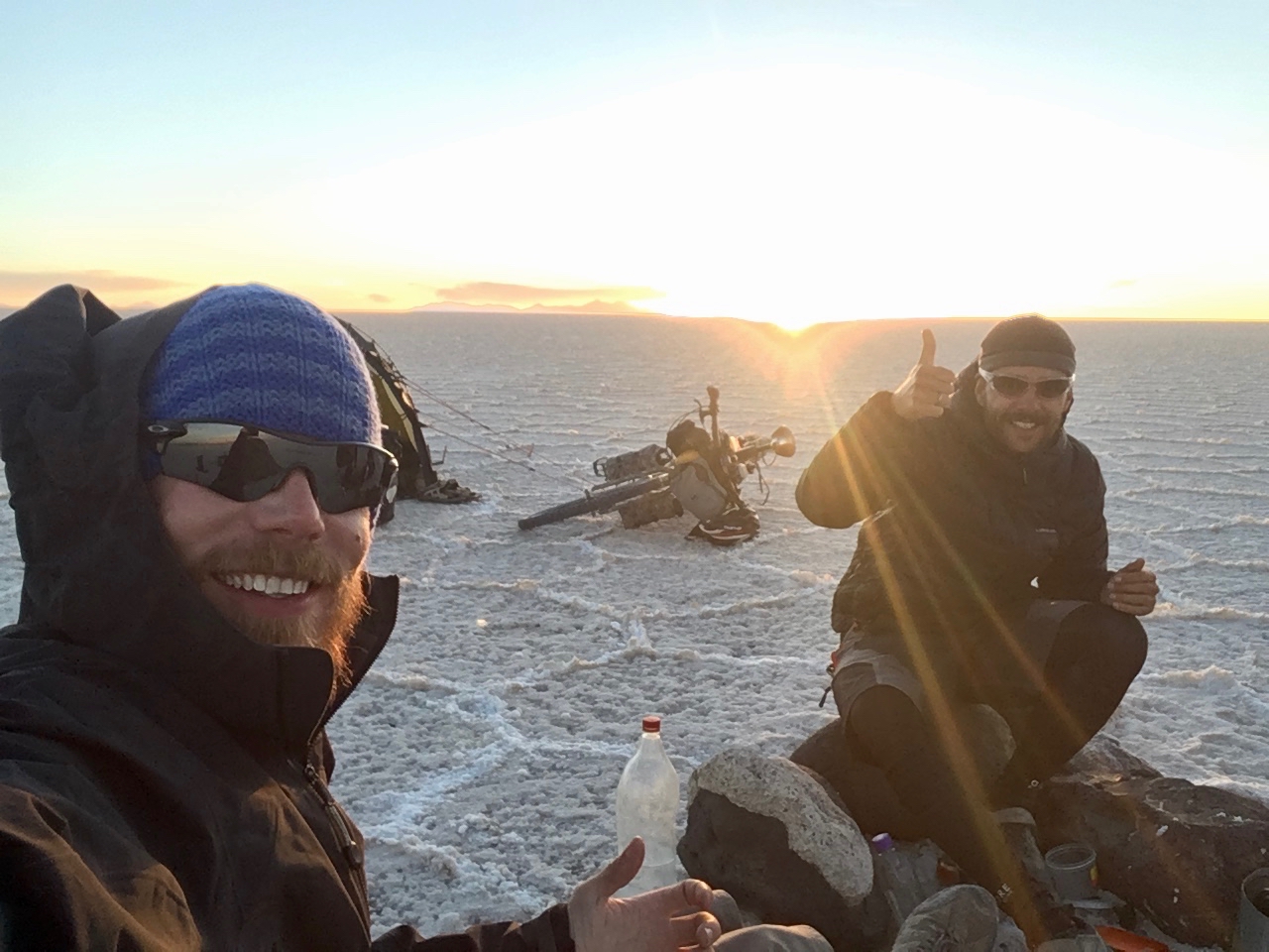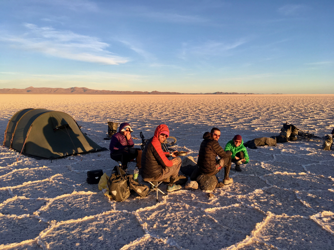 With the headwind, we decided to take it fairly easy and camp out on the Salar that night. After a quick visit to the Salt Hotel (you can no longer stay there), we set up camp out on the open salt. Sunset was absolutely magical…