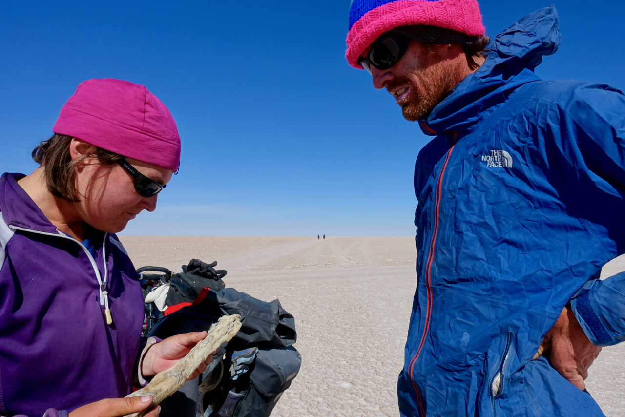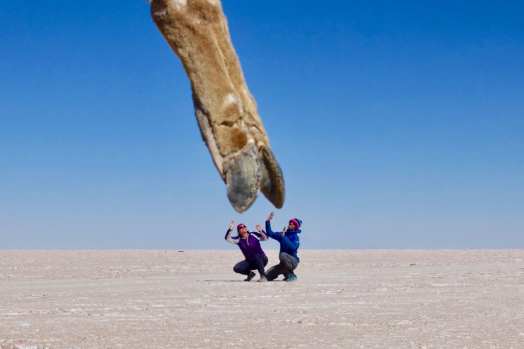 The next day we had only a short distance left to the edge of the Salar and then on to Uyuni town. Neil and Vicky were pondering the llama leg that they had picked up from the roadside when it suddenly attacked them…