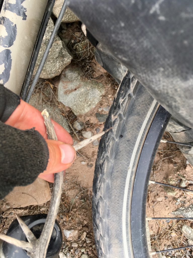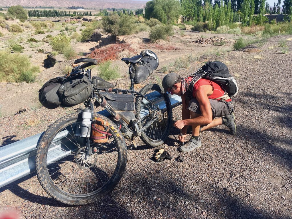 With Thomas and Tina planning to stick to the 40 through San Juan to Mendoza and me wanting to heading off on a little ‘scenic’ detour, Scott and I headed off together the next day. Having lunch under a tree, we remarked on the size of the thorns around these parts – with water a scarce commodity, all plants seem to have evolved considerable defences. A couple of hours later, having stopped for a drink, I looked over to see a small branch of the aforementioned thorns hanging from my rear tyre, one of them having penetrated right through the sidewall. Pulling them out produced a rapid hissing, followed by a deep breath and the well-practised routine of getting the rear wheel off!