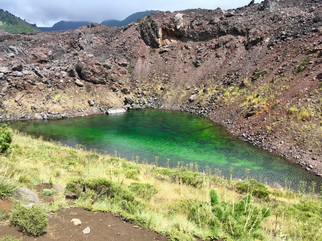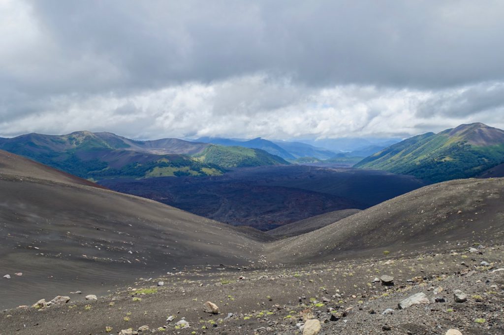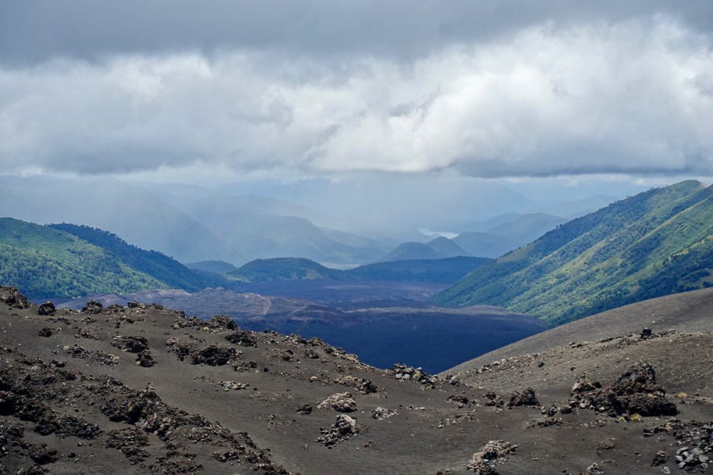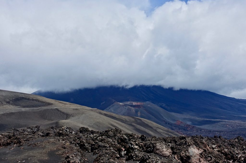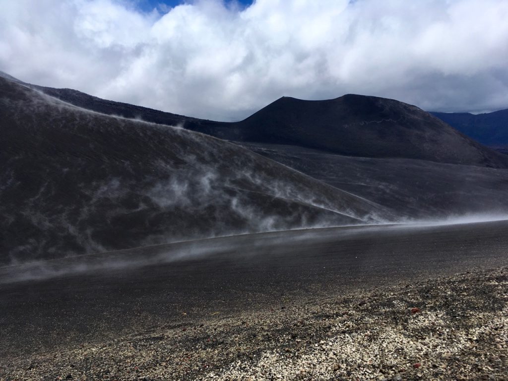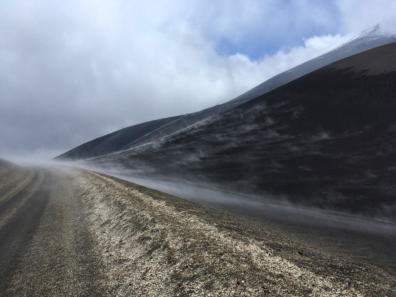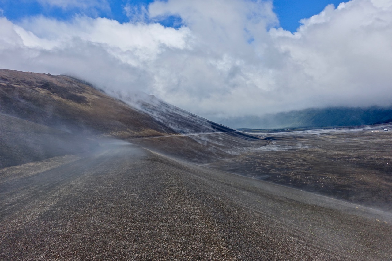 After reaching a mirador (viewpoint) near the pass and stopping for some photos, I head off to cover the last few hundred metres and start the descent. My timing, however, couldn’t be worse. A squall is passing through just as I cross over the exposed ‘shoulder’ of the mountain. I find myself being battered by rain/sleet/hail, propelled by a ferocious wind. I try to ride on but it’s stinging my face so badly that I have little option other than to stop. With nowhere to shelter, I resort to laying my bike down beside the road and huddling into a ball with my back to the onslaught! Somewhat amused by the situation I got myself into, I wait it out for a few minutes and then push the bike a hundred metres or so to the end of the pass. As the sun pokes through between the clouds, it warms up the black slopes of the volcano and steam rises all around me, making for an extraordinary sight…
