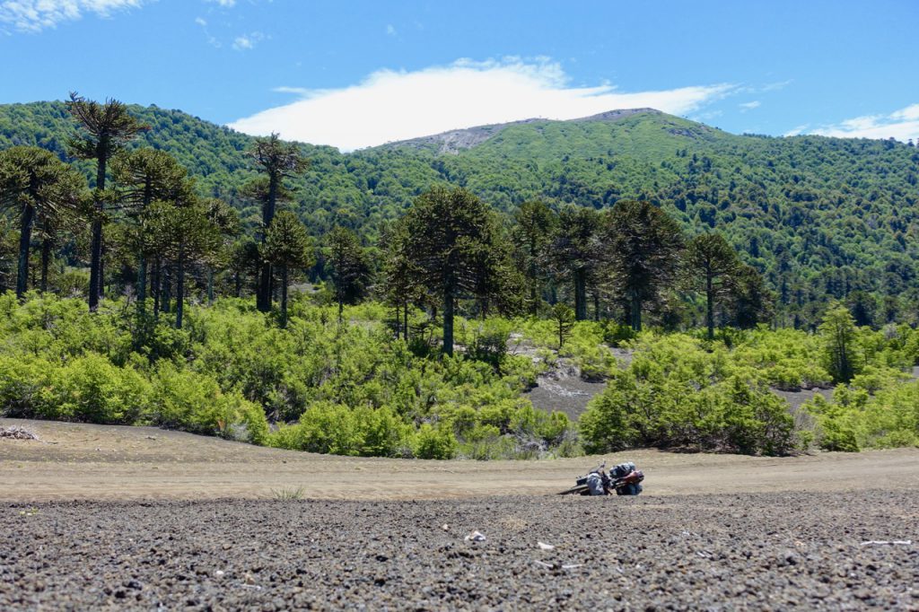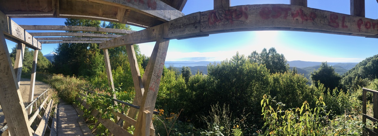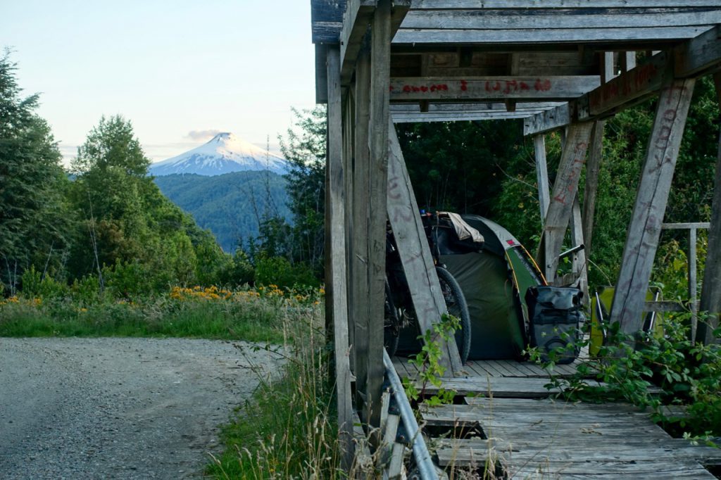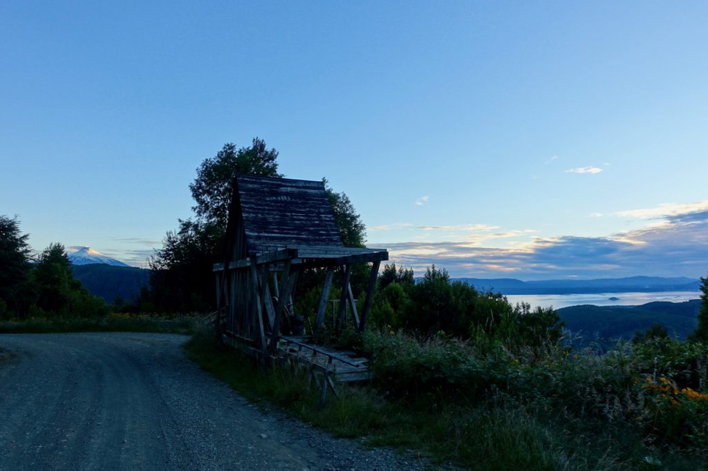 Cruising along paved roads for much of the day towards my lakeside destination of Pucón, after a while I decide to take a dirt-road detour to see if I can find a campsite next to another nearby lake. It turns out, however, that private property prevents me from even getting a glimpse of this lake and the route takes me up some leg-breaking slopes (up to 30% gradient). Frustrated at the limited camping opportunities, I come across a roadside mirador with a great view. With little traffic coming past (even the cars where clearly shy of the brutal gradients), I decide to make it my home for the night…