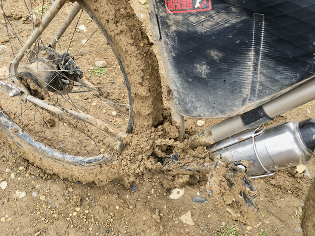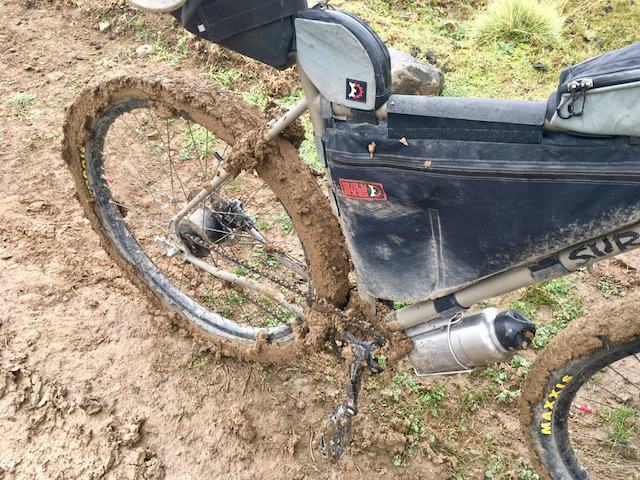 Soon after, I noticed the surface getting a little muddier but didn’t think too much of it – it was just surface mud rather than anything particularly deep. Rolling downhill into a small dip, my wheels rapidly began to pick up mud and I noticed the rear of the bike skidding about a little. Looking down, they had both become completely covered in it, hence the lack of traction. It wasn’t long before the wheels could no longer turn and the drivetrain was totally swamped by the stuff. At one point, on a downhill section, I ground to a complete stop, such was the stopping power of the mud! With me on the bike, the rear wheel would just about still turn, but the mud would accumulate much faster. With me off the bike, the rear wheel would quickly jam up and I would be left pushing the bike with the rear wheel skidding over the surface, acting as a severe brake to my efforts. The only solution was, where possible, to stay off the track and push direct across the scrubland of the mountainside!