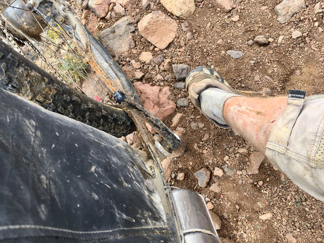 Having done so well the day before to keep my shoes relatively dry, I found myself grind to a halt in the middle of a particularly boggy section with no dry spots to put my foot down on! My foot was covered in slimy red mud and the other one soon followed as I had to dismount the bike and push to firmer ground. In need of a wash, I figured I might as well leave them on whilst I crossed the river thereafter. It made life much easier, as I had to cross multiple times to find a rideable path. I was dreading, however, once I’d made camp and my feet really started to cool down. Putting on freezing wet shoes the next morning is never a nice experience!