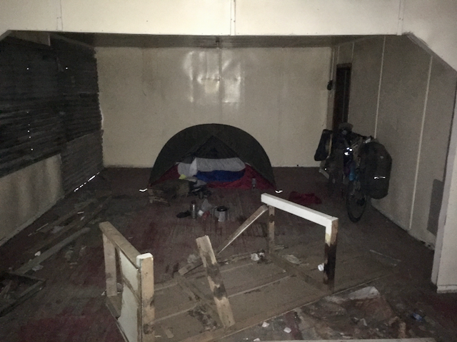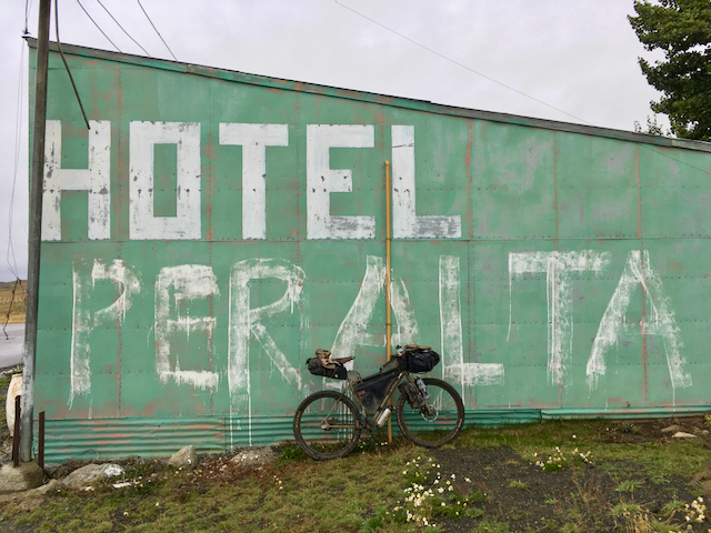With about 40km left to get to the nearest decent shelter (another abandoned hotel), I put the hammer down and made good progress on decent ripio. However, with about 6km to go to my destination and the evening rapidly drawing in, I suddenly heard a hissing sound from my rear wheel and looked down to see sealant spraying out of the tyre. This was the first major puncture that I’d experienced on my tubeless tyres. For those not familiar with tubeless, it’s very straightforward – you ‘seal’ the rim of the tyre using an air-tight tape and then ideally use a tubeless-specific tyre. This mounts in the same way as a normal bicycle clincher tyre but has a slightly more refined/preciser fit. Think of it as more akin to a car tyre. Once mounted, you squirt a sort of liquid latex sealant through the valve and pump it up. This sealant remains liquid inside the tyre and helps seal either any microscopic holes in the tyre or any breaks in the interface between the rim and tyre, ensuring that it is air-tight. In the event of a puncture, the sealant will also congeal in the holes and plug them. Much of the time, with minor punctures, this works so well that the rider is hardly even aware of the puncture until they see a slight dribble of dried or drying sealant oozing from the tyre and doesn’t require any attention. Indeed, my tyres had their fair share of pin-prick punctures like this. In the event of a larger gash, it may be necessary to orientate the cut to the bottom of the wheel, to allow the sealant to pool there, whilst applying a bit of pressure to the puncture. This was what I now had to do. The hissing slowed down and, before long, stopped entirely but not before the tyre had lost a considerable amount of pressure. Pumping it back up, the hissing started again but slowly sealed, this time with a little more pressure. The size of the cut was clearly borderline, in terms of what the sealant is capable of dealing with. With the light fading and the first signs of rain imminent, I decided to just put the ‘technology’ to the test! Lo and behold, it held until I made it to the abandoned Hotel Peralta!