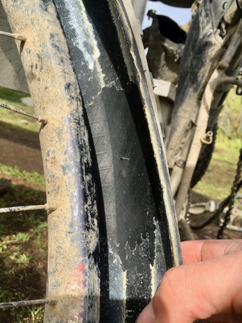 Readying ourselves to set off, I pumped up my tyres, only to find that the cut in my tubeless tyre didn’t particularly like the increase in pressure and so I sent Ryan on ahead, whilst I set about repairing it. In this case, I was able to take the tyre off, clean the area up and apply a tube patch to the interior.