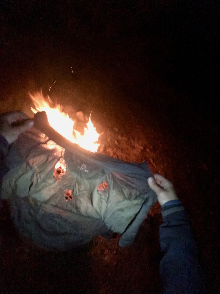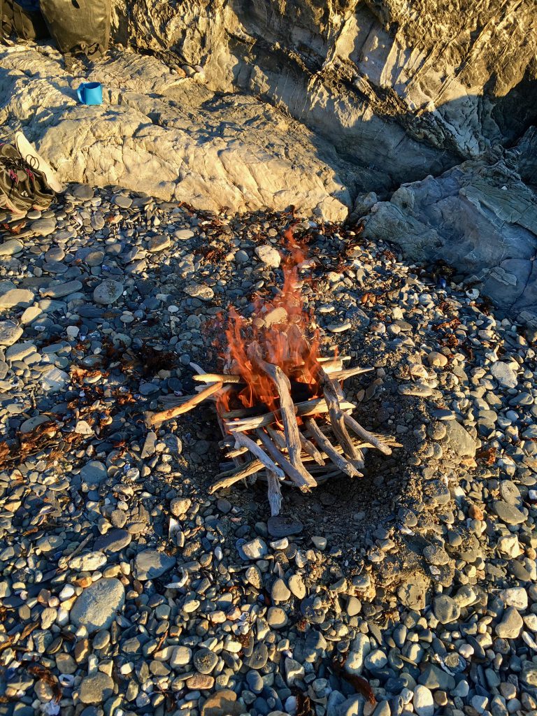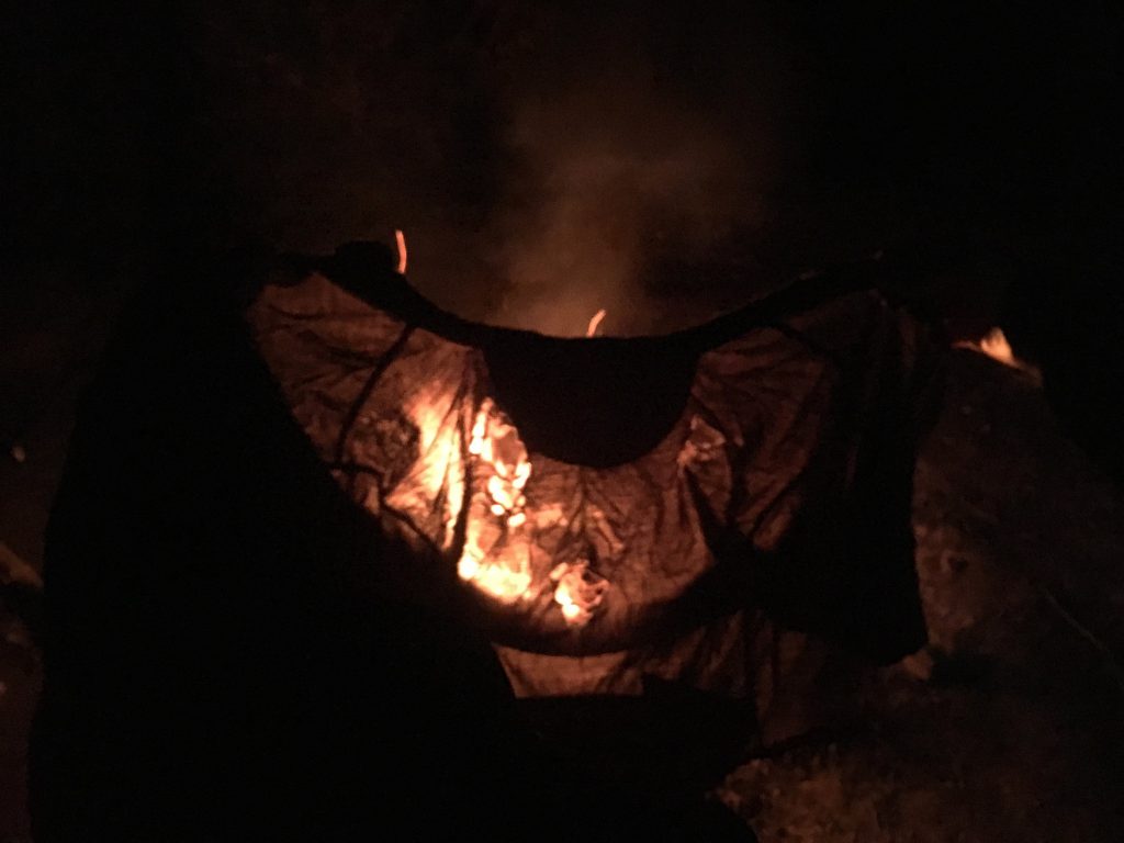 In the end, we found ourselves back at the campsite that we’d been at the night before, slightly cursing the fact that we hadn’t just hidden all our bags there that morning and ridden in lightweight mode for the day! Once again, we were treated to a lovely sunset to round off a great day. There was time for the odd fire ritual too – the burning of my now very holey merino top!